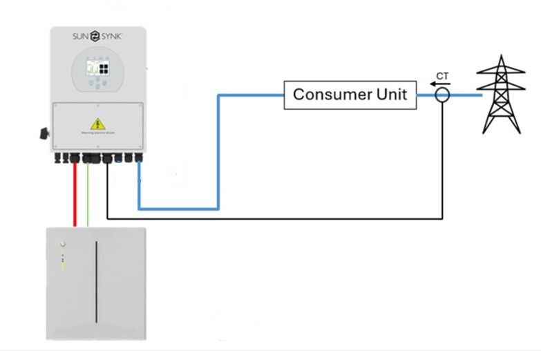 The AC inverter also has the ability to use cheep electricity from the national grid connection to charge linked battery pack. Once the battery has been fully charged the system can then provide low cost power at times when needed.